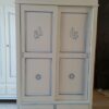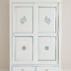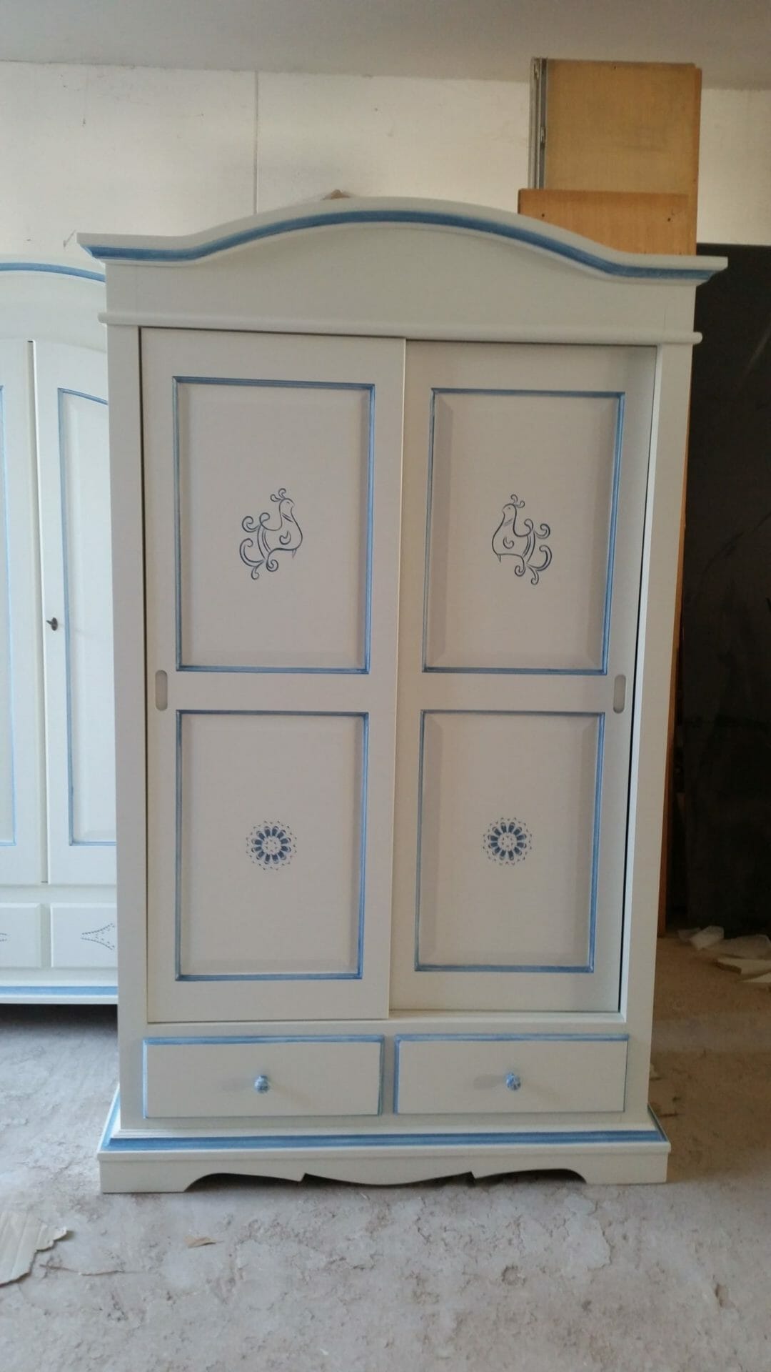 e 2 cassetti in legno tinto bianco opaco con intagli rigorosamente fatti a mano e profili in tinta carta da zucchero.