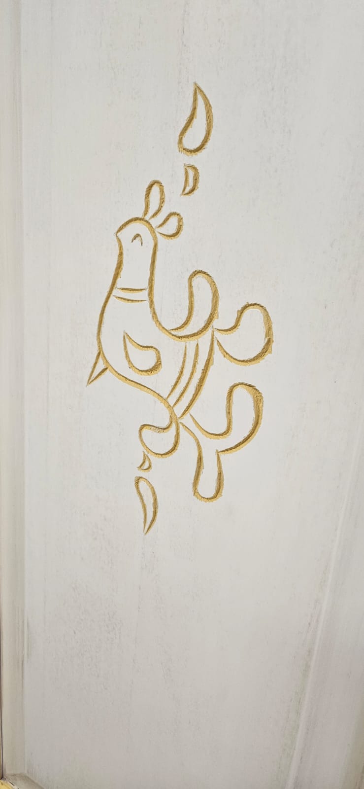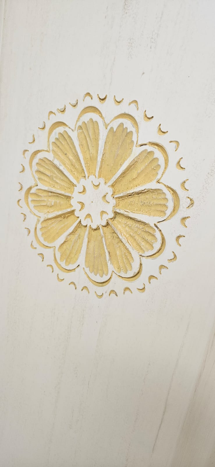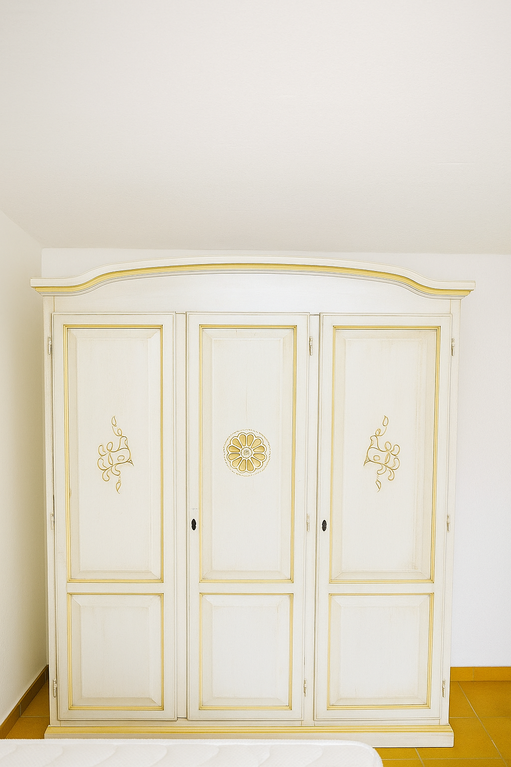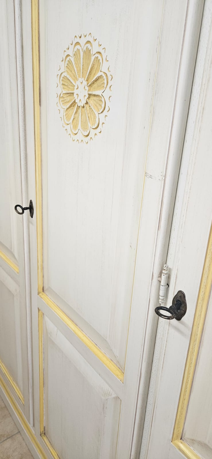 Armadio 3 ante in legno tinto bianco opaco con intagli tradizionali sardi fatti a mano.