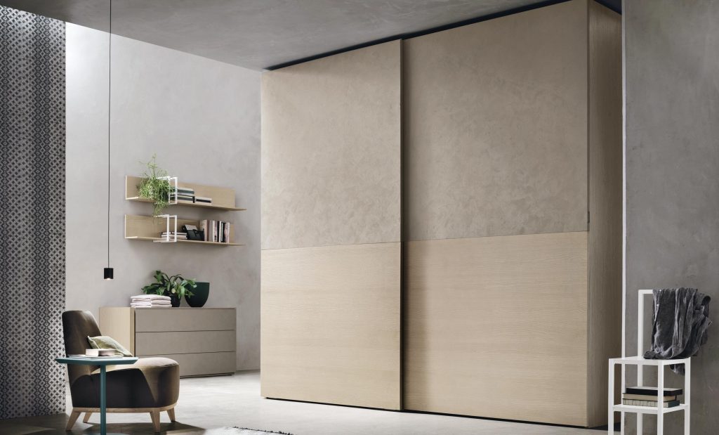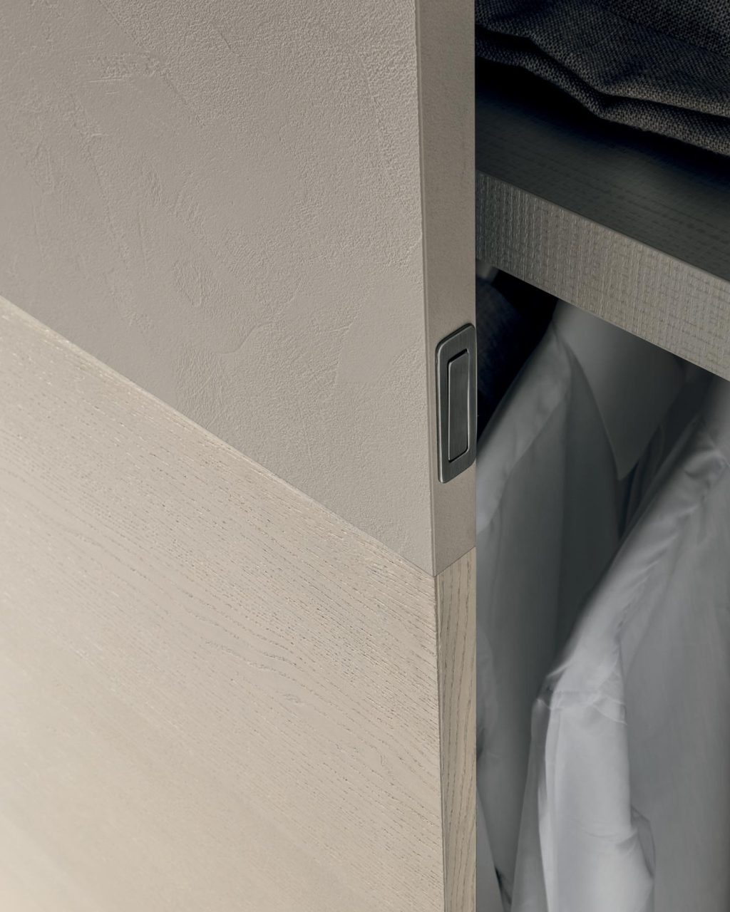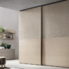 Ante scorrevoli materico cemento cava e materico rovere sabbia. Struttura materico rovere sabbia e maniglia Clip.