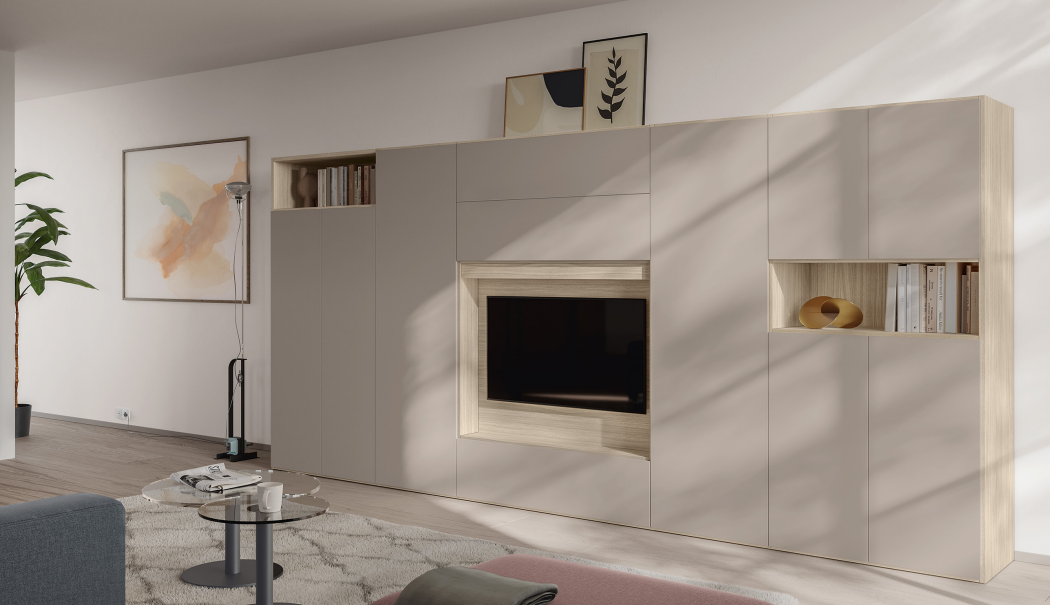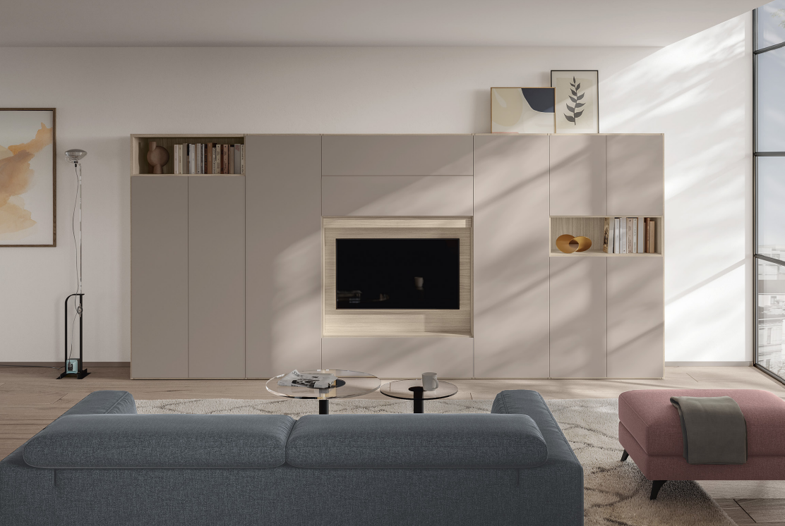 soggiorno moderno componibile dal design elegante e lineare, arricchito dalla Libreria Infinity a terra in controspinta profondità e da un pratico vano TV centrale. Una soluzione che unisce estetica e funzionalità, offrendo spazi dedicati sia all’organizzazione dei libri che alla zona multimediale. Le tonalità calde dei colori della terra creano un’atmosfera accogliente e raffinata, trasformando il living in un ambiente contemporaneo, ordinato e ricco di personalità