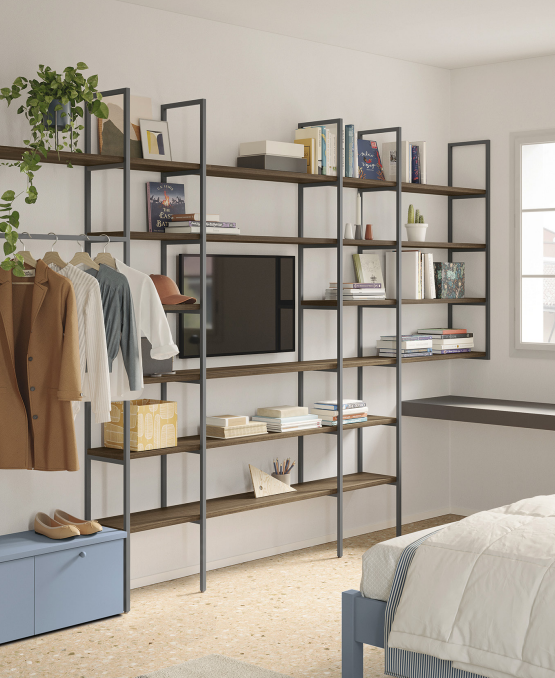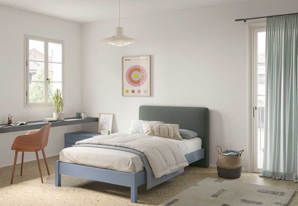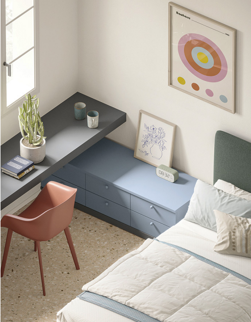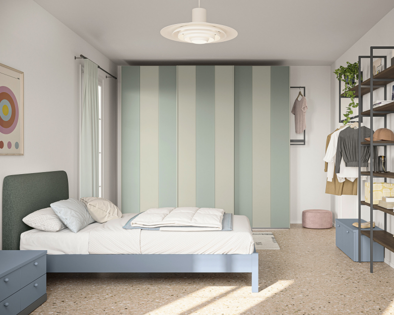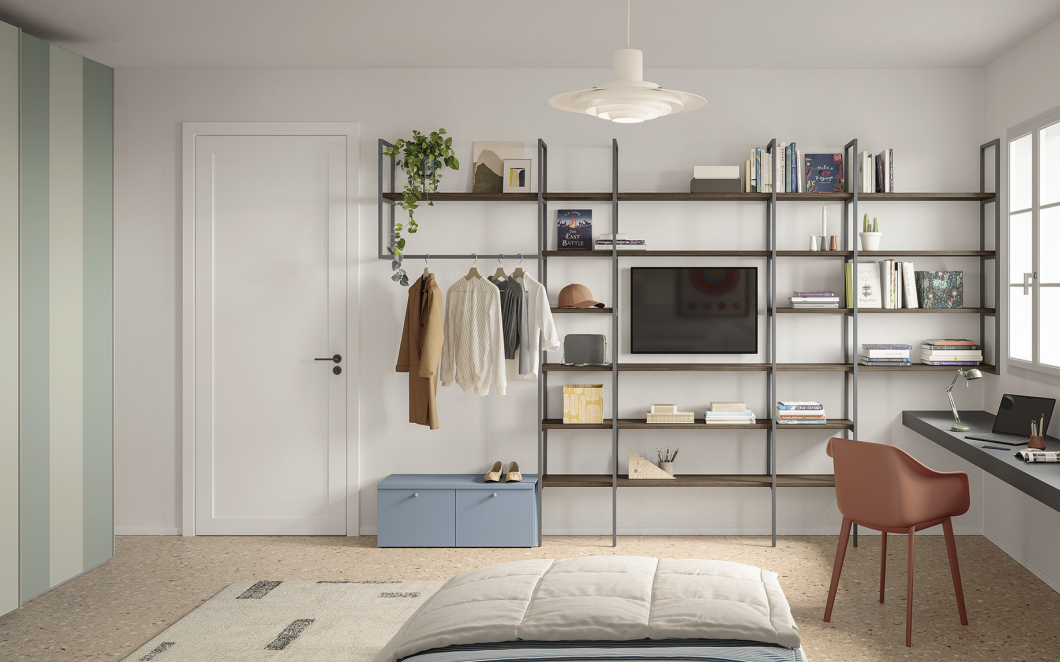 Una soluzione moderna e versatile pensata per accompagnare i ragazzi in ogni momento della loro crescita. La composizione unisce praticità e design: letto confortevole, armadi spaziosi e organizzati, scrivania funzionale per lo studio e zone contenitive intelligenti per tenere tutto in ordine
