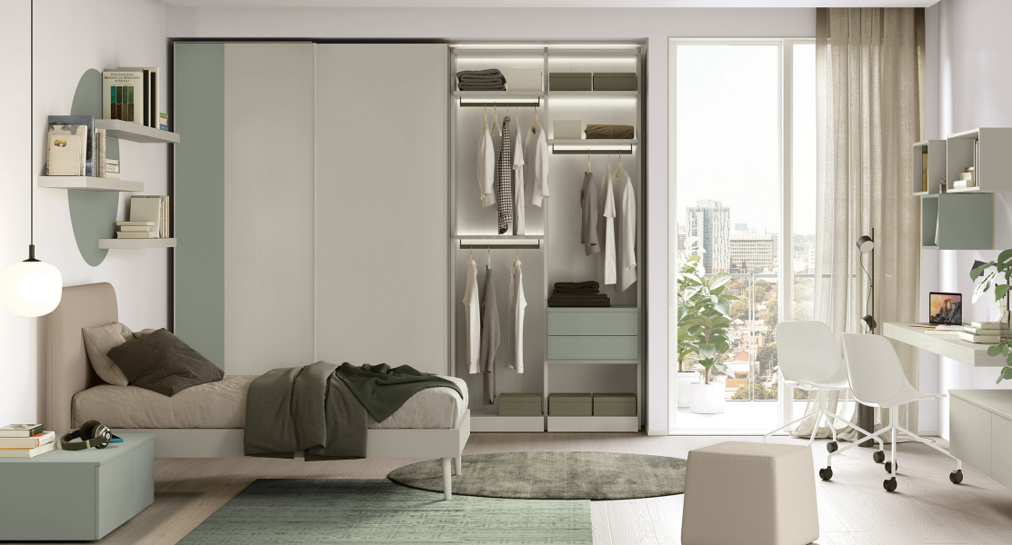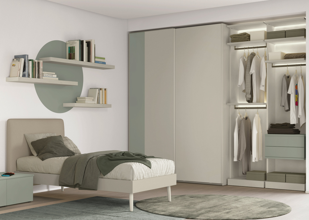 Il letto accogliente garantisce riposo e relax, l’armadio modulare offre la massima capienza senza rubare spazio, mentre la scrivania diventa il quartier generale perfetto per studio, creatività e passioni. Ogni dettaglio è studiato per crescere con loro: soluzioni salvaspazio intelligenti, linee moderne e colori giovani che rendono la stanza un luogo unico, dove nulla è lasciato al caso.
