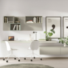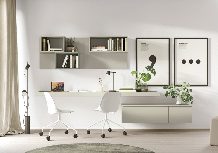 boiserie, scrivania e sedie, componibili sospesi.