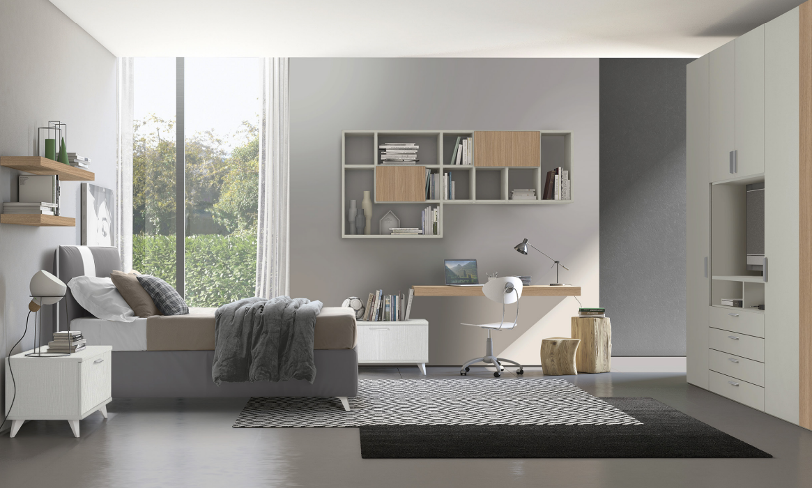 Non un semplice spazio, ma il punto di partenza di ogni giornata. Questa camera componibile è progettata per rispondere a tutte le esigenze dei ragazzi di oggi: studio, relax, gioco e momenti di libertà. Il letto accogliente diventa rifugio, l’armadio modulare organizza senza sprechi, la scrivania è il centro nevralgico di creatività e concentrazione.