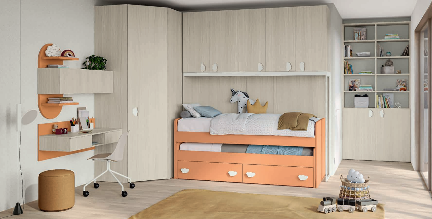 Realizzata con materiali sicuri e resistenti, e arricchita da colori vivaci, questa soluzione accompagna la crescita dei bambini, adattandosi facilmente alle loro esigenze. Una cameretta intelligente e modulare, dove organizzazione, design e allegria si incontrano in un unico spazio
