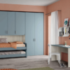 Massima praticità e stile in un unico arredo! La cameretta a ponte sfrutta lo spazio in altezza, combinando letto, armadi e scaffali in un design compatto e funzionale. Ogni elemento è pensato per mantenere ordine e organizzazione, lasciando libero lo spazio centrale per giocare, studiare o rilassarsi.