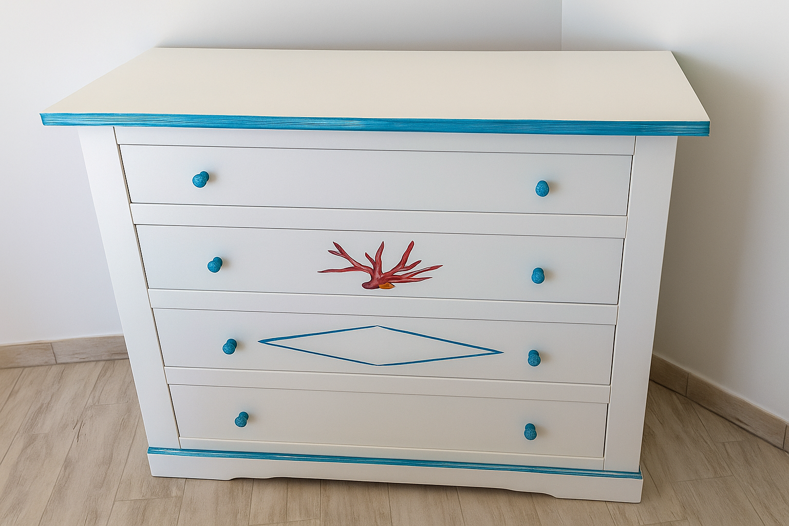 Finitura bianco opaco con intagli in bassorilievo di un corallo con conchiglia ed un rombo decorativo.