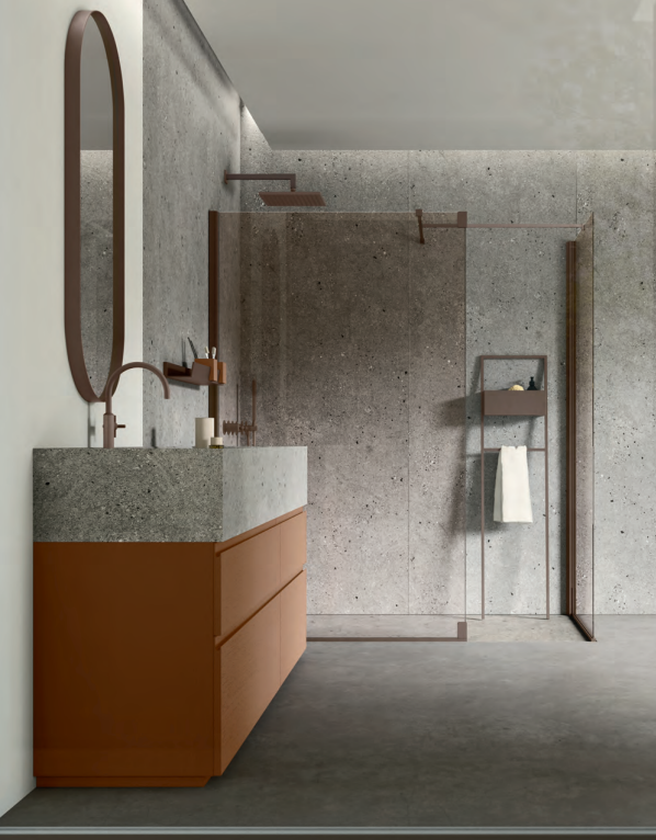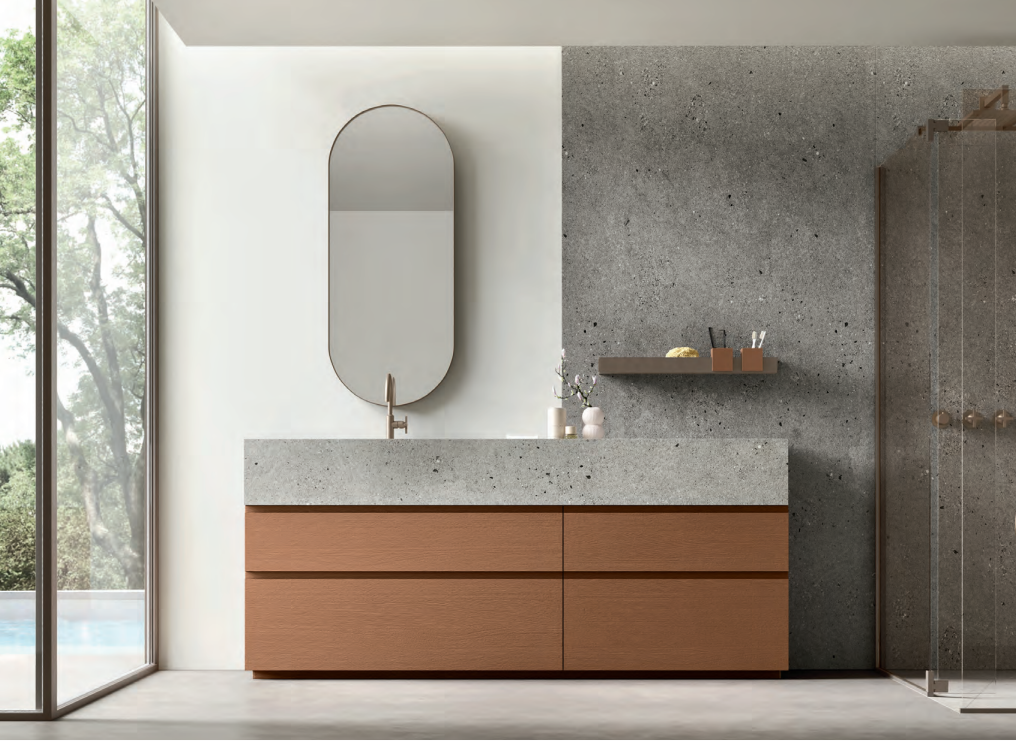 Composizione bagno moderna dal design lineare e funzionale, pensata per unire ordine ed eleganza in un ambiente contemporaneo. Le linee essenziali e le geometrie pulite dialogano con le tonalità calde della terra, creando un’atmosfera naturale e accogliente. La disposizione razionale degli elementi valorizza lo spazio e ne facilita l’utilizzo quotidiano, mentre le finiture curate e i materiali di qualità conferiscono armonia e carattere. Una soluzione che esprime sobrietà , comfort e stile senza tempo.