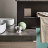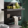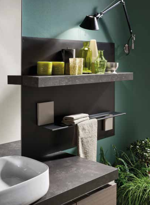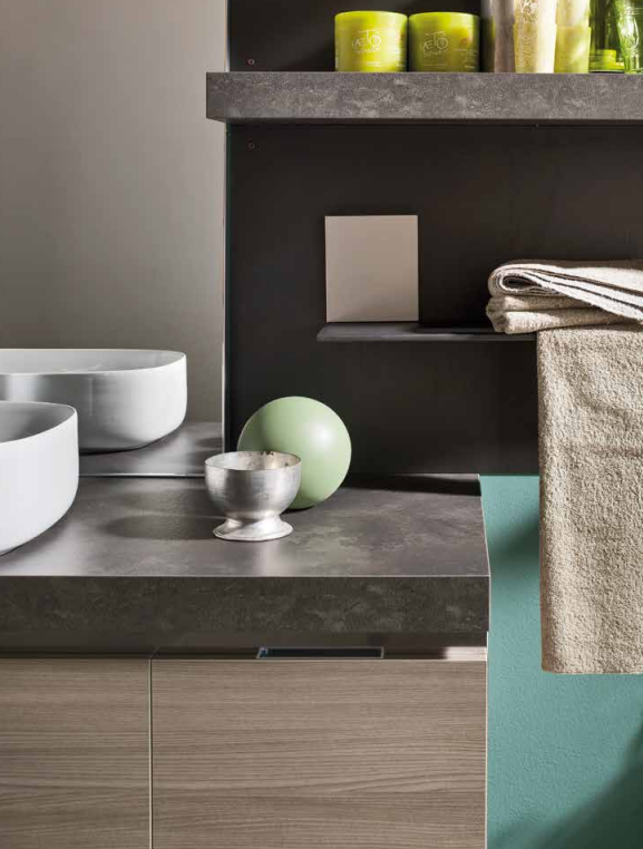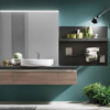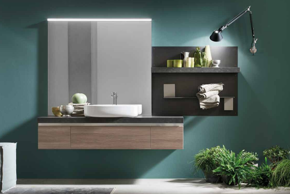 Composizione bagno lineare nelle calde tonalità del legno, alleggerita da superfici chiare e ravvivata da dettagli verdi. L’apertura a gola esalta le linee essenziali, offrendo un ambiente naturale, moderno e accogliente.