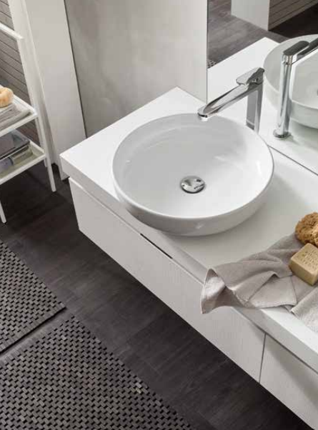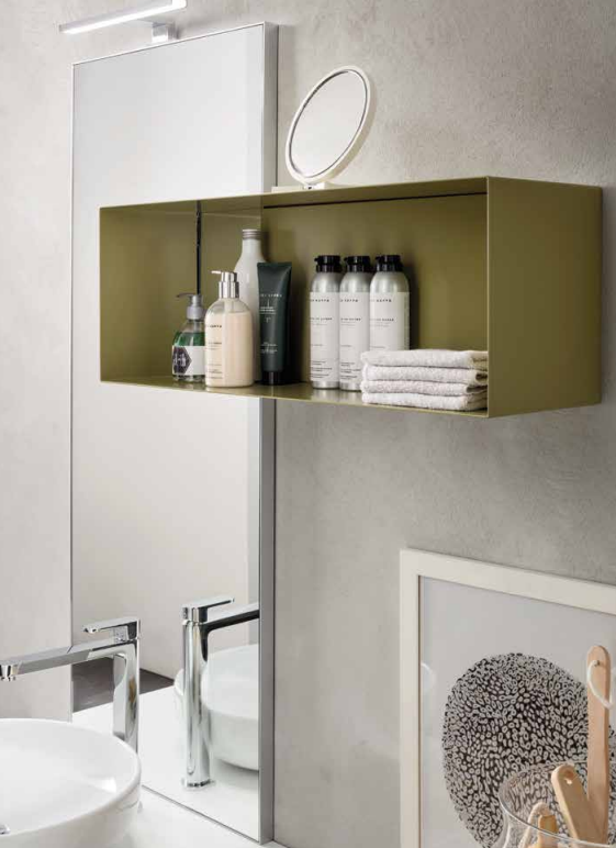 Composizione bagno lineare dal design essenziale: superfici chiare che ampliano la percezione dello spazio, abbinate a dettagli verdi che donano freschezza e armonia. Un ambiente luminoso, ordinato e naturale, pensato per un comfort quotidiano elegante e rilassante