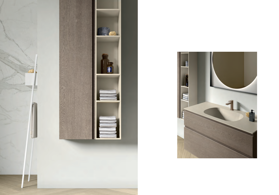 Composizione bagno moderna dal design lineare e funzionale, pensata per trasformare lo spazio quotidiano in un’oasi di benessere. Le linee pulite si uniscono a finiture calde e accoglienti, creando un ambiente armonioso dove eleganza e comfort convivono. La disposizione attenta degli elementi valorizza ogni dettaglio e offre praticità senza rinunciare allo stile, regalando al bagno un’atmosfera intima, raffinata e sempre funzionale