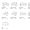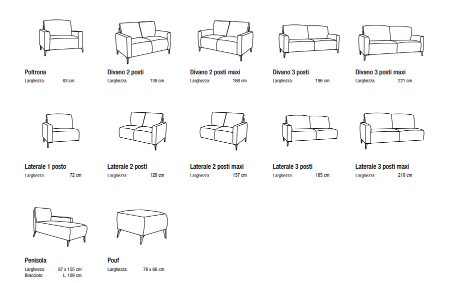 piuma, speciale mix di poliestere ritorto a ricciolo e piuma, rivestiti in tela cotone/poliestere. Braccioli imbottiti in poliuretano D35 indeformabile.