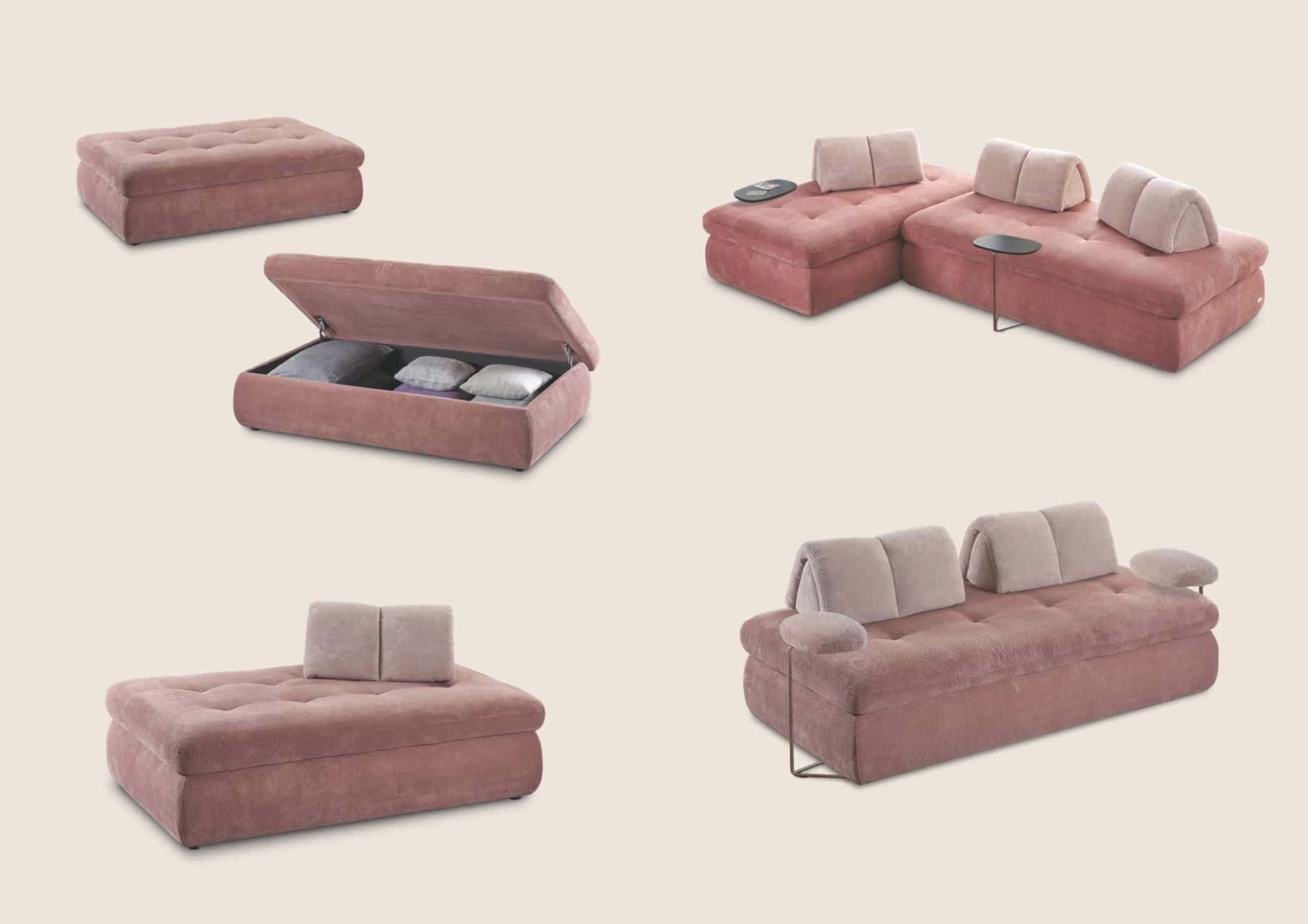 Optional: penisola contenitore con un cuscino schienale aggiuntivo, braccioli fissi o trasformabili con tavolino magnetico.