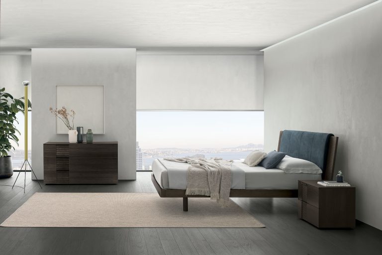 Il letto Bliss in materico rovere moka condivide il nome, la finitura e la lavorazione tridimensionale caratterizzata da un effetto canettè con il gruppo abbinato. La testiera è ammorbidita da un pannello imbottito che, oltre a valorizzare l’estetica con diversi tessuti e colori, è estremamente confortevole per rilassarsi.