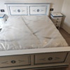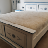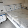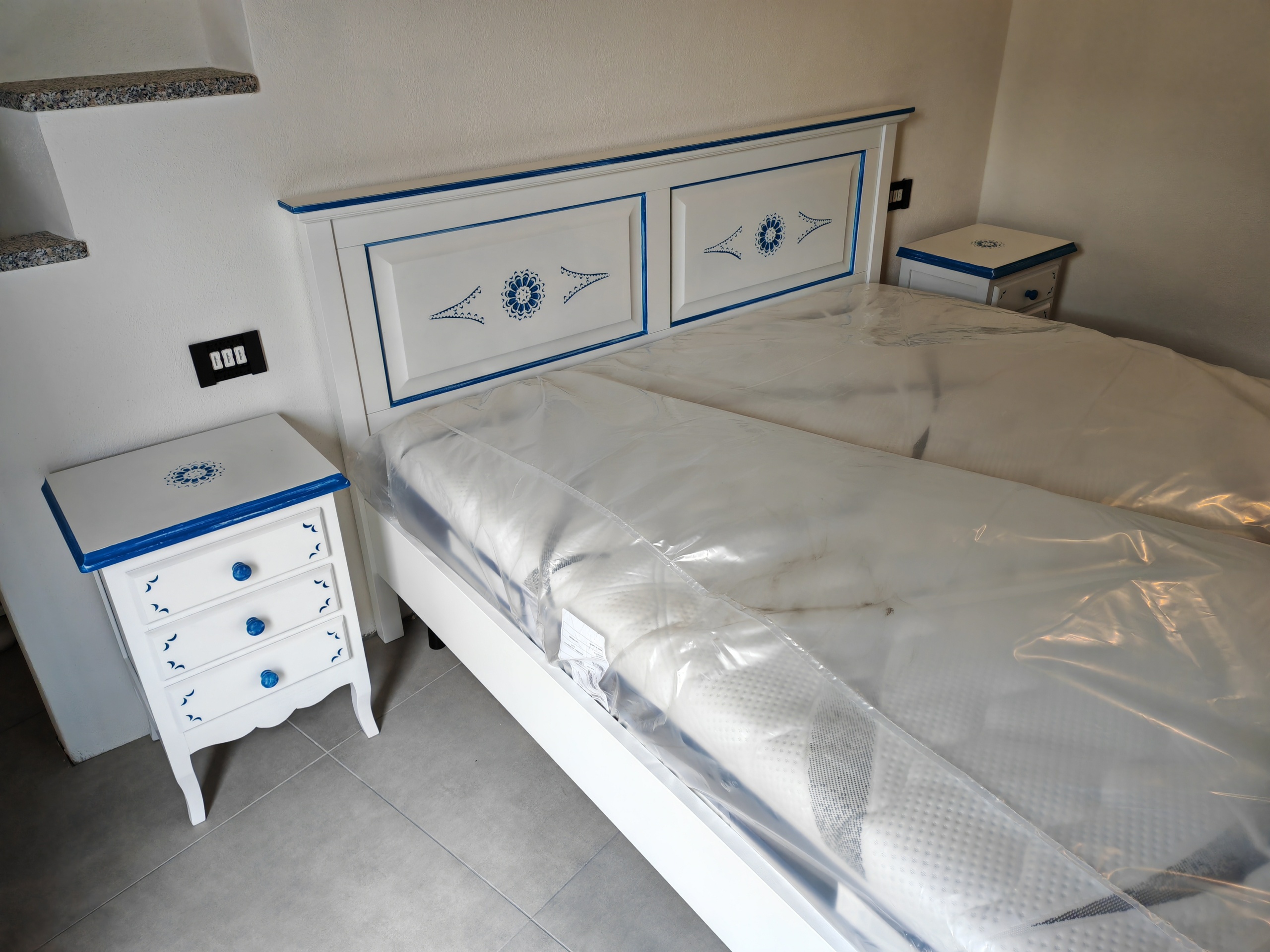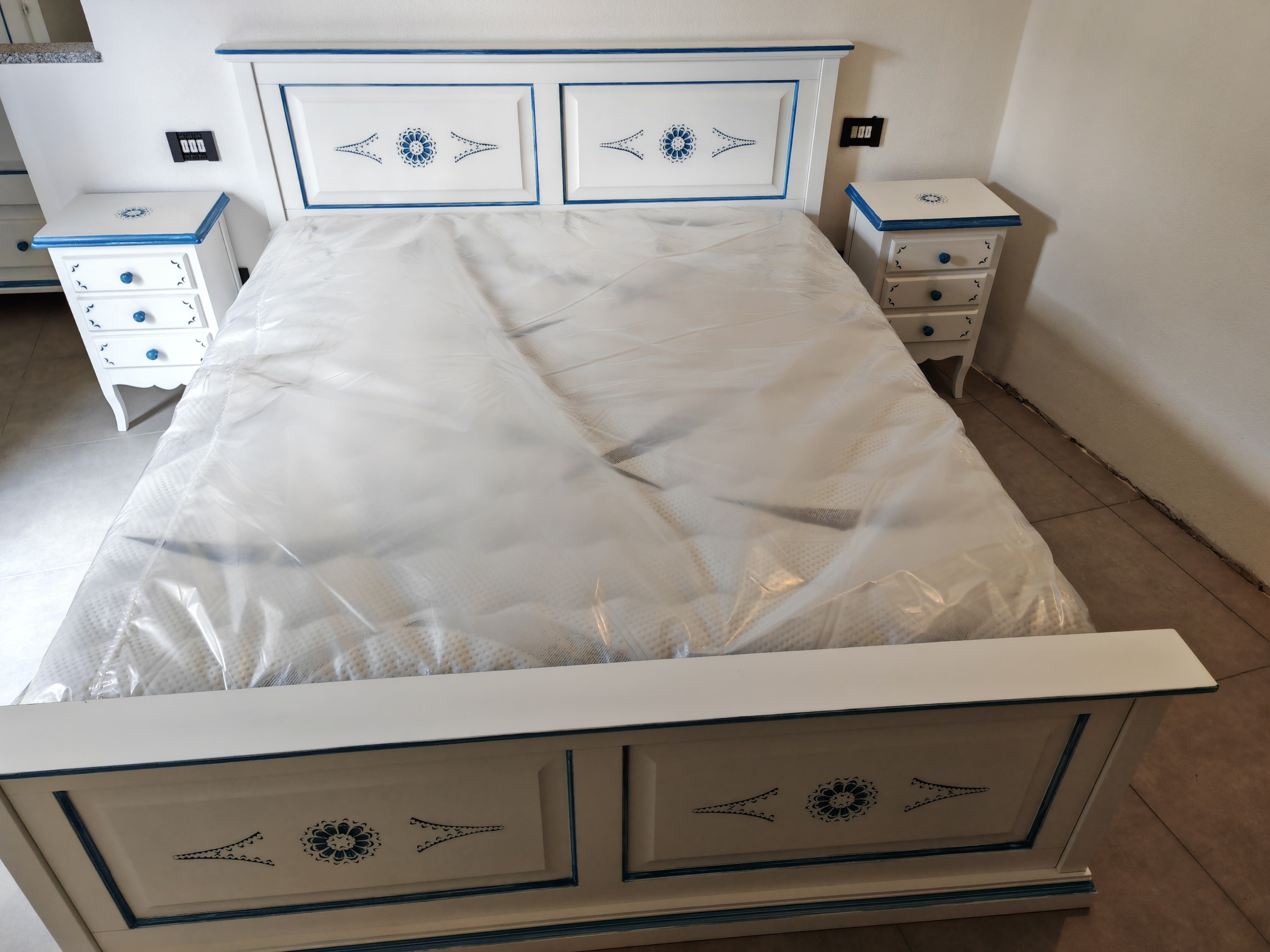 In legno di pioppo tinto bianco opaco con intagli e profili tinta carta da zucchero nella testiera e nella pediera.
