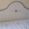 In legno di pioppo tinto bianco opaco con intagli e profili tinta carta da zucchero nella testiera e nella pediera.