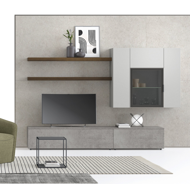 La parete attrezzata nei toni del cemento porta un tocco industriale e contemporaneo alla zona giorno, unendo design essenziale e funzionalità. Le sfumature grigio-neutre creano profondità e carattere, valorizzando l’ambiente con uno stile moderno e sofisticato. Grazie alla sua struttura versatile, permette di organizzare libri, oggetti e dispositivi con ordine, coniugando estetica e praticità in modo equilibrato.