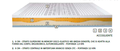 6 CM – STRATO SUPERIORE IN MEMORY VISCO ELASTICO (MEDIA DENSITÀ) CHE SI ADATTA ALLA FORMA DEL CORPO. ERGONOMICO. AUTOFORMANTE – DENSITÀ 40 KG / M3 – RESISTENZA 1,9 KPA