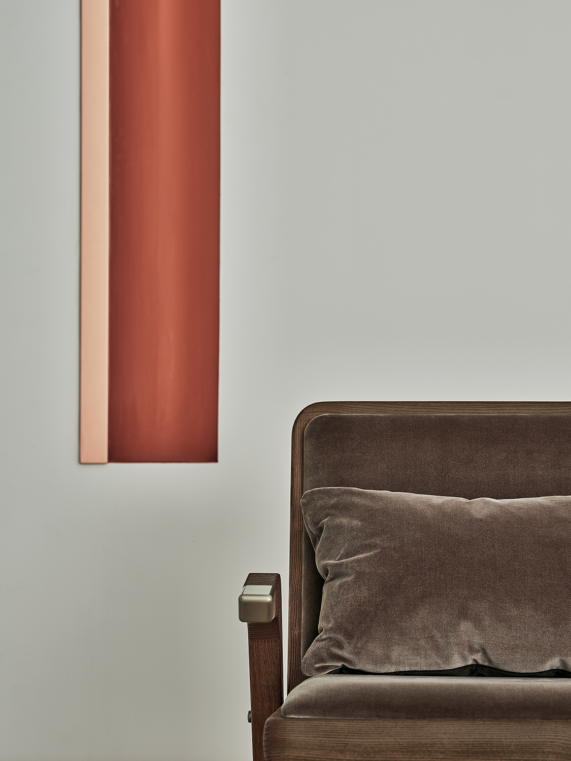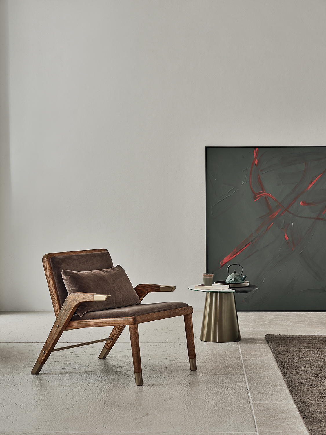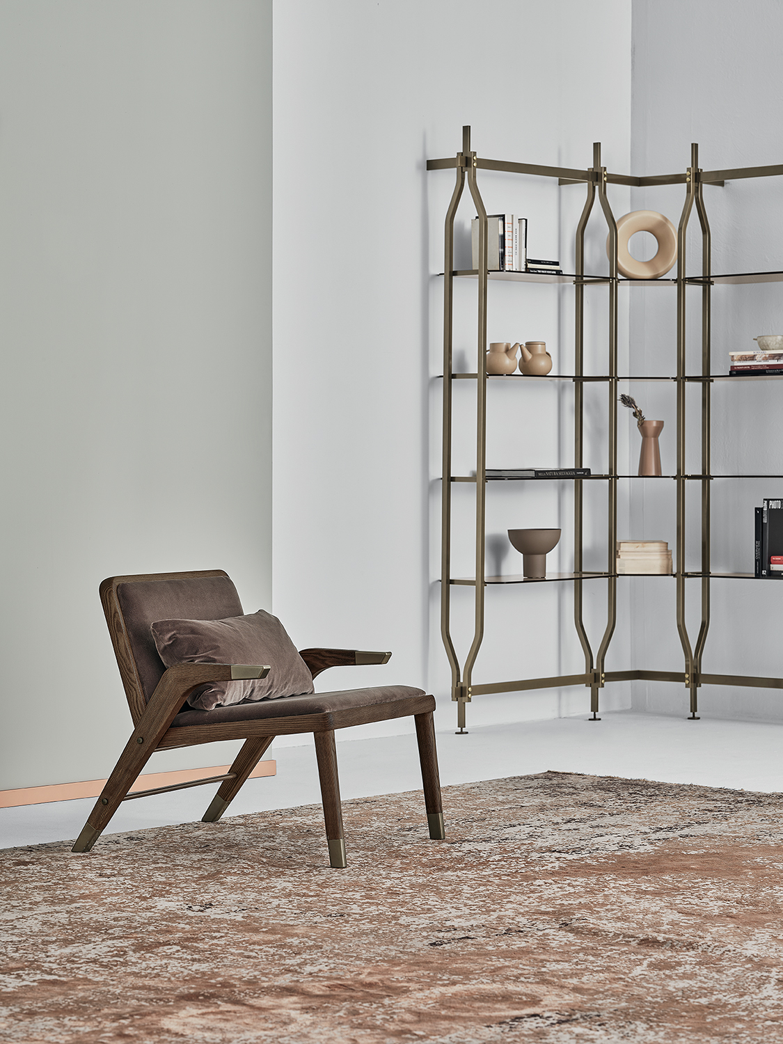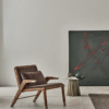 Poltrona con cuscino poggia reni sfoderabile e imbottito in poliuretano flessibile. Struttura in legno massello con dettagli decorativi in acciaio laccato. Poltrona e cuscino imbottiti con rivestimento in pelle Ecologica Premium, tessuto Bouquet, tessuto Nordic, Pure Virgin Wool, velluto Supreme, tessuto Kvadrat Field, tessuto Kvadrat Coda e pelle Premium.