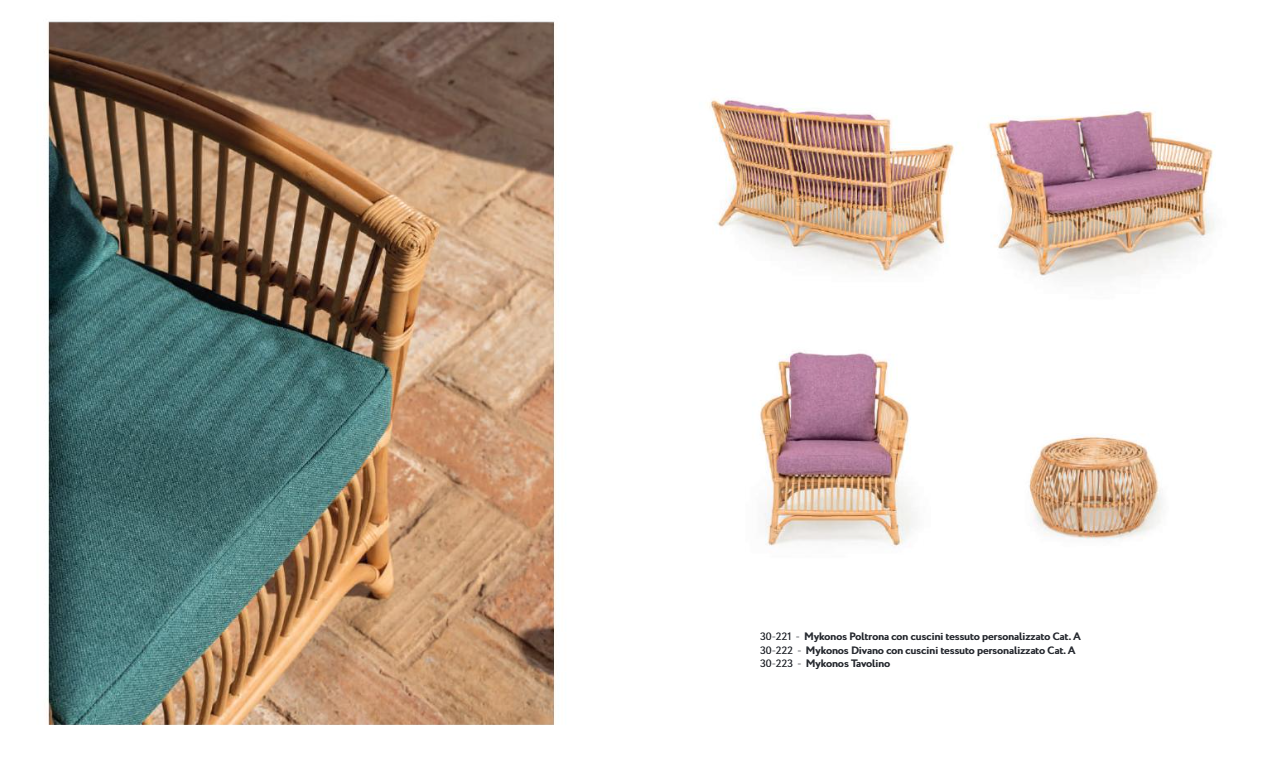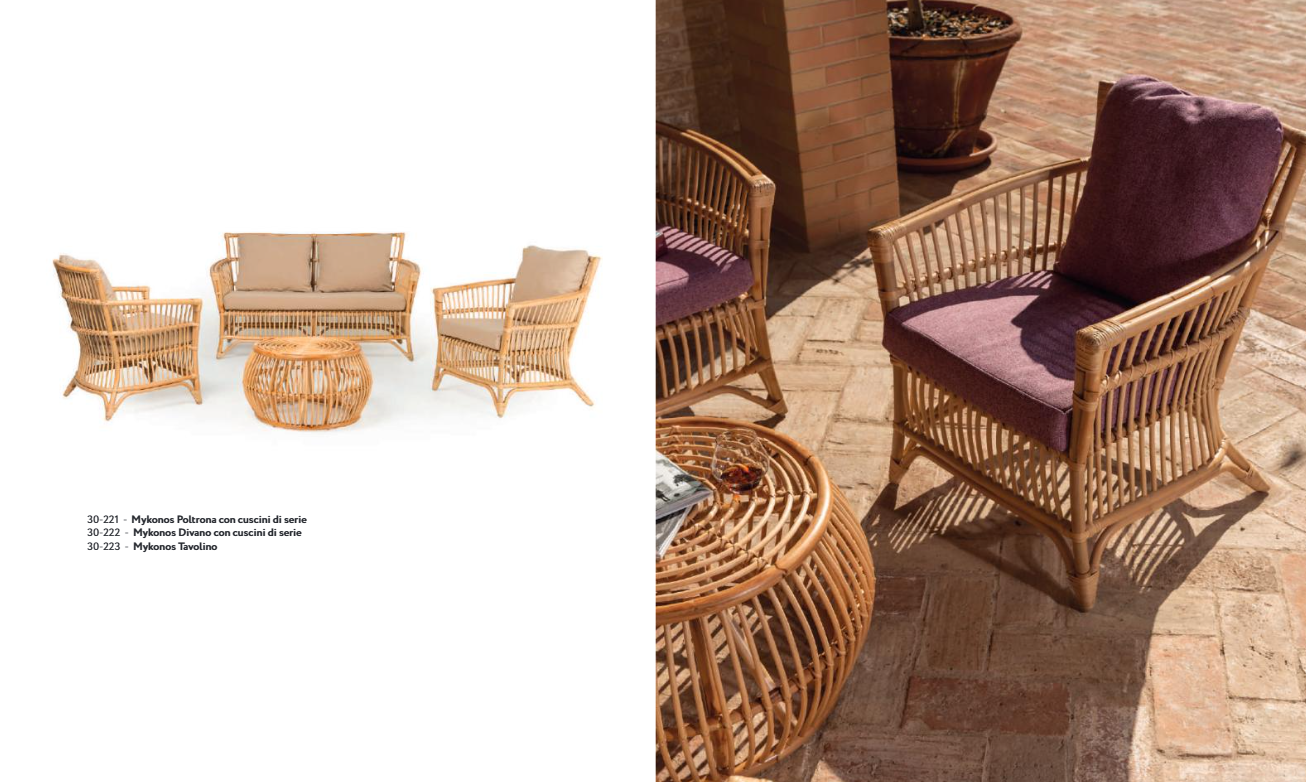 LA SERIE MYKONOS NASCE DALLA RIVISITAZIONE DEL NOSTRO CLASSICO CAMILLE E LO PORTA VERSO UNA MAGGIORE ESSENZIALITA’. SCHIENALI PIU’ALTI E LINEE LONGITUDINALI CHE CORRONO PARALLELE PER TUTTA LA STRUTTURA . UN DESIGN ORIGINALE CHE  UNISCE COMFORT E RAFFINATEZZA ESTETICA IN UNA VESTE COMPLETAMENTE NATURALE.
