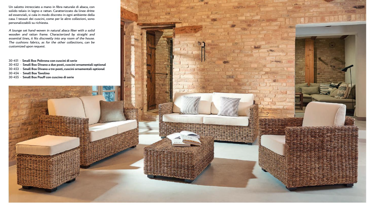 UN SALOTTO INTRECCIATO A MANO IN FIBRA NATURALE DI ABACA, CON SOLIDO TELAIO IN LEGNO E RATTAN. CARATTERIZZATO DA LINEE DRITTE ED ESSENZIALI, SI CALA IN MODO DISCRETO IN OGNI AMBIENTE DELLA CASA. I TESSUTI DEI CUSCINI SONO PERSONALIZZABILI SU RICHIESTA.