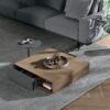 Il tavolino Theo interpreta il living con un’estetica rigorosa e soluzioni intelligenti. Il cassetto integrato e il vano laterale offrono spazio utile per mantenere l’ambiente ordinato, senza perdere la praticità di avere a portata di mano gli oggetti di uso quotidiano.