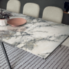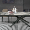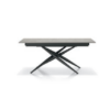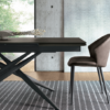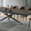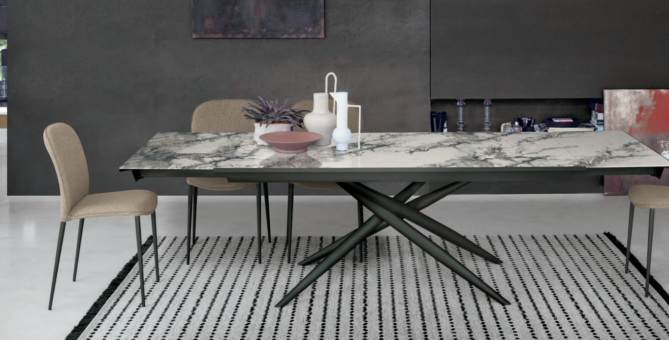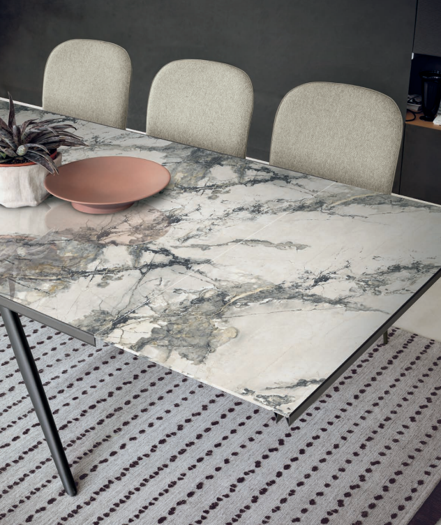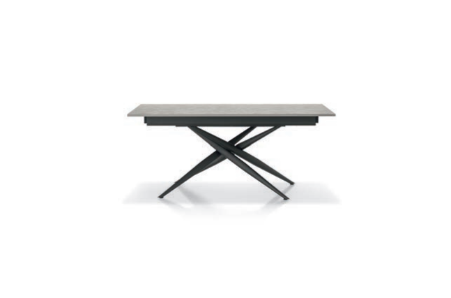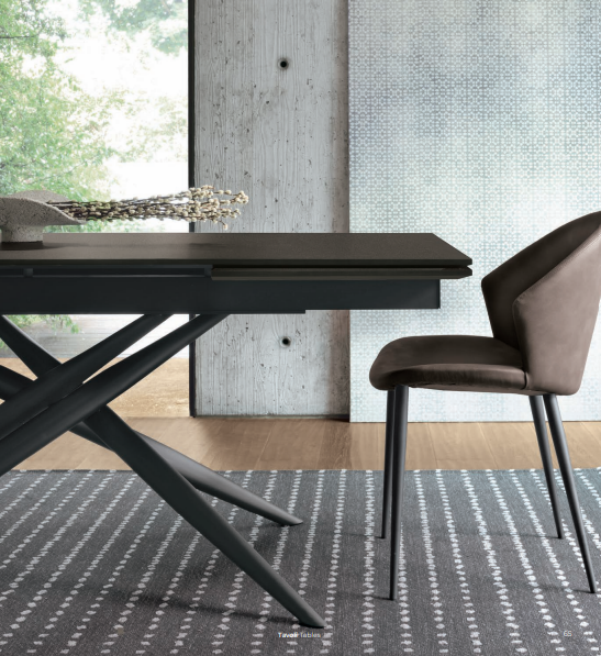 Il tavolo si distingue per le quattro gambe a sezione ellittica conificate alle