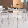 La struttura è proposta in metallo cromato, mentre il piano è in vetro temperato serigrafato disponibile extrabianco.