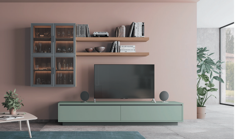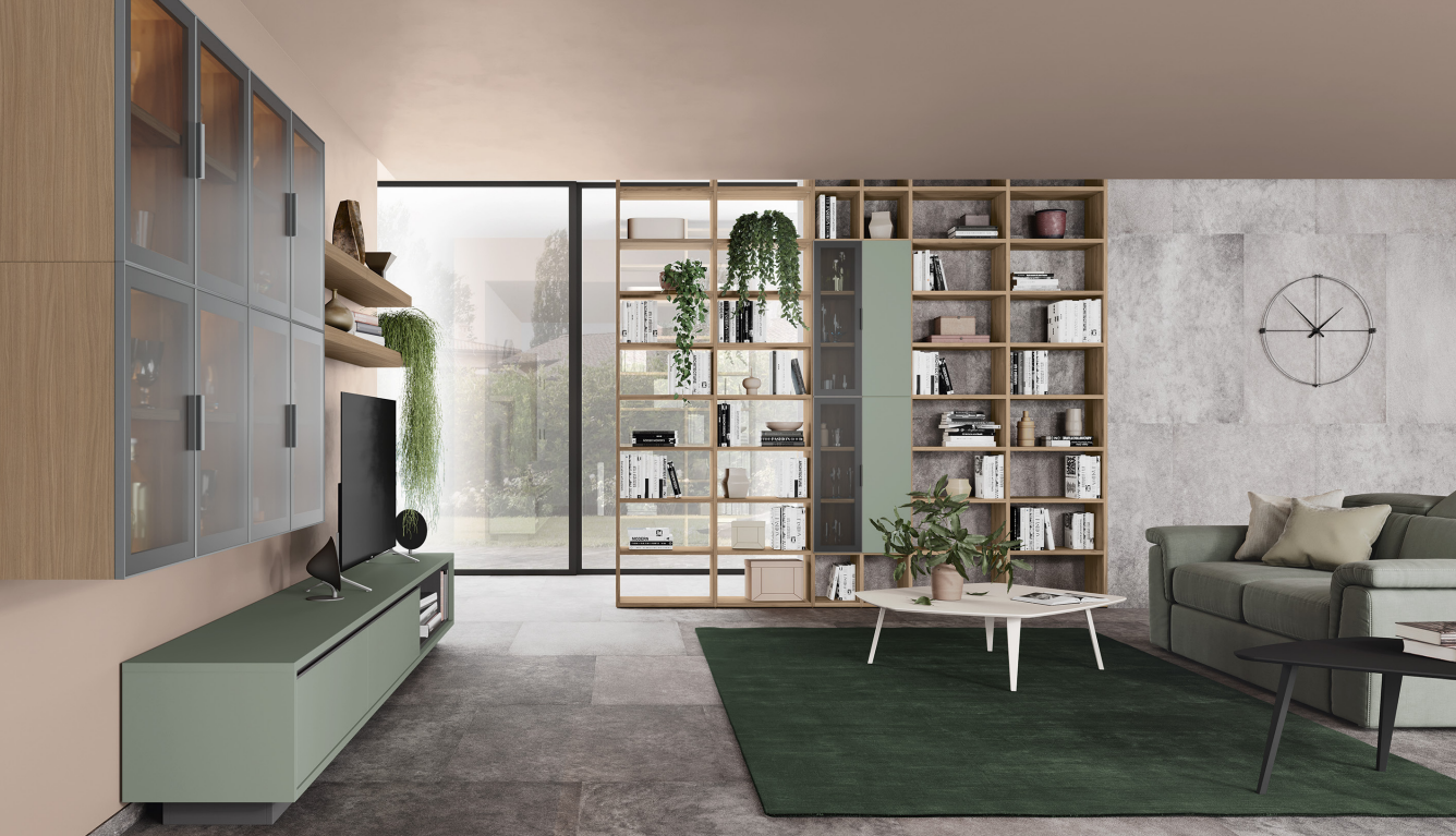 Soggiorno moderno componibile dal design lineare e raffinato, dove eleganza e funzionalità si incontrano. La presenza della libreria integrata rende l’ambiente ancora più dinamico e versatile: uno spazio dedicato ai libri, ma anche agli oggetti decorativi che raccontano lo stile di chi lo vive. Le soluzioni modulari permettono di adattare il soggiorno a diverse esigenze abitative, creando un living ordinato, accogliente e contemporaneo